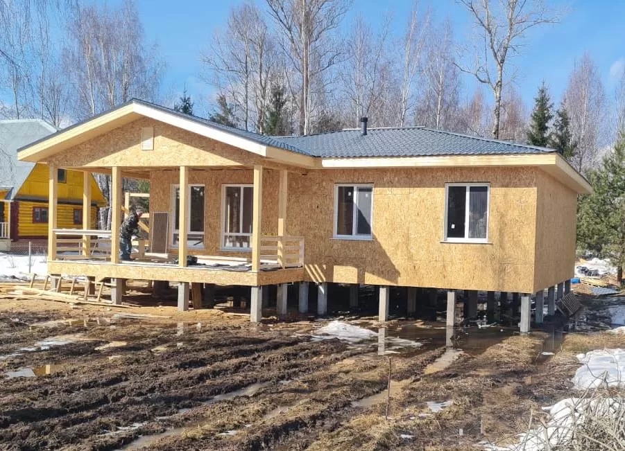 Современный двухэтажный дом с большими окнами, покатой темно-коричневой крышей, акцентами из дерева и камня и крытым крыльцом — идеальный пример каркасного дома в Московской области, окруженного деревьями и зеленью. Современный деревянный дом, построенный в стиле дома из клееного бруса, с большими окнами и темно-серой крышей стоит на травянистом участке. Небо пасмурное, на заднем плане видны соседние дома и деревья. Современный светло-коричневый деревянный дом с серой крышей и большим крытым крыльцом стоит на травянистой земле под частично пасмурным небом — отличный пример каркасных домов в Московской области. На заднем плане видны деревья и еще один дом. Современный двухэтажный каркасный дом с крутой двускатной крышей, большими окнами и крыльцом, возвышающийся на сваях, окруженный травой и частично пасмурным небом.
